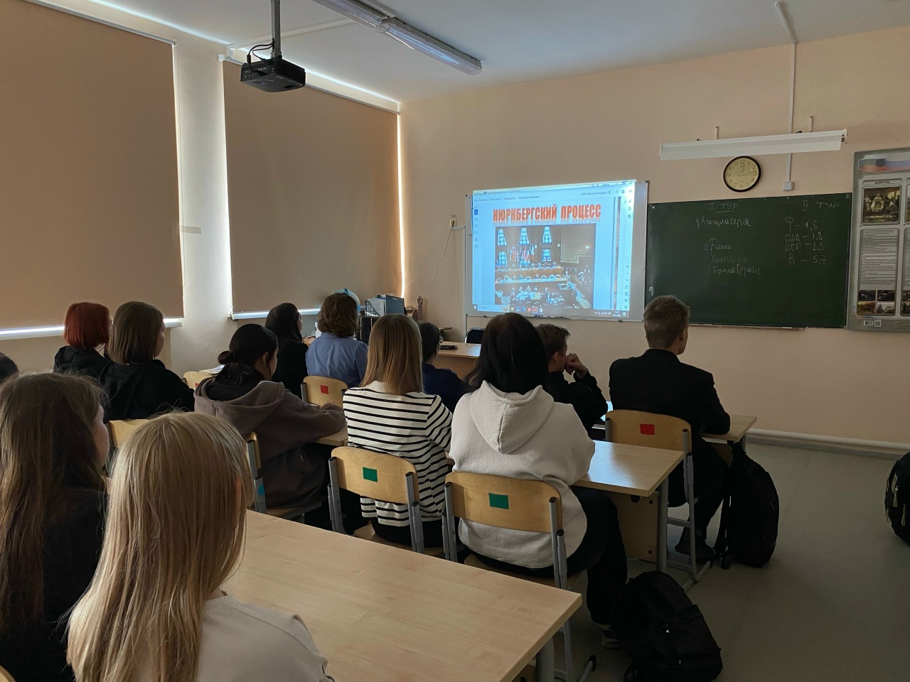 В ходе урока вниманию учащихся была представлена кинохроника «День начала Нюрнбергского процесса». По завершении урока десятиклассники приняли активное участие в интеллектуальной игре "Нюрнбергский процесс - суд народов".